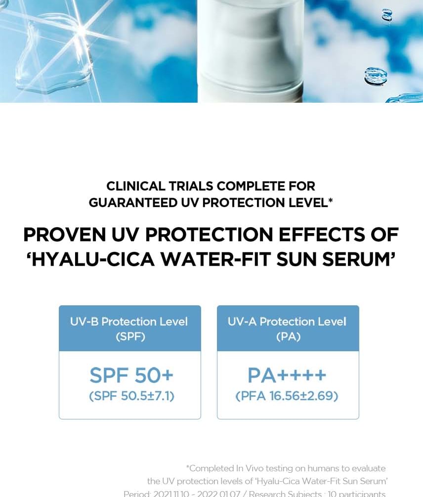 - Fitted with SPF 50+ PA++++, this serum-like sunscreen containing Hyaluronic Acid and Centella Asiatica Extract soothes and hydrates skin while providing sun protection.